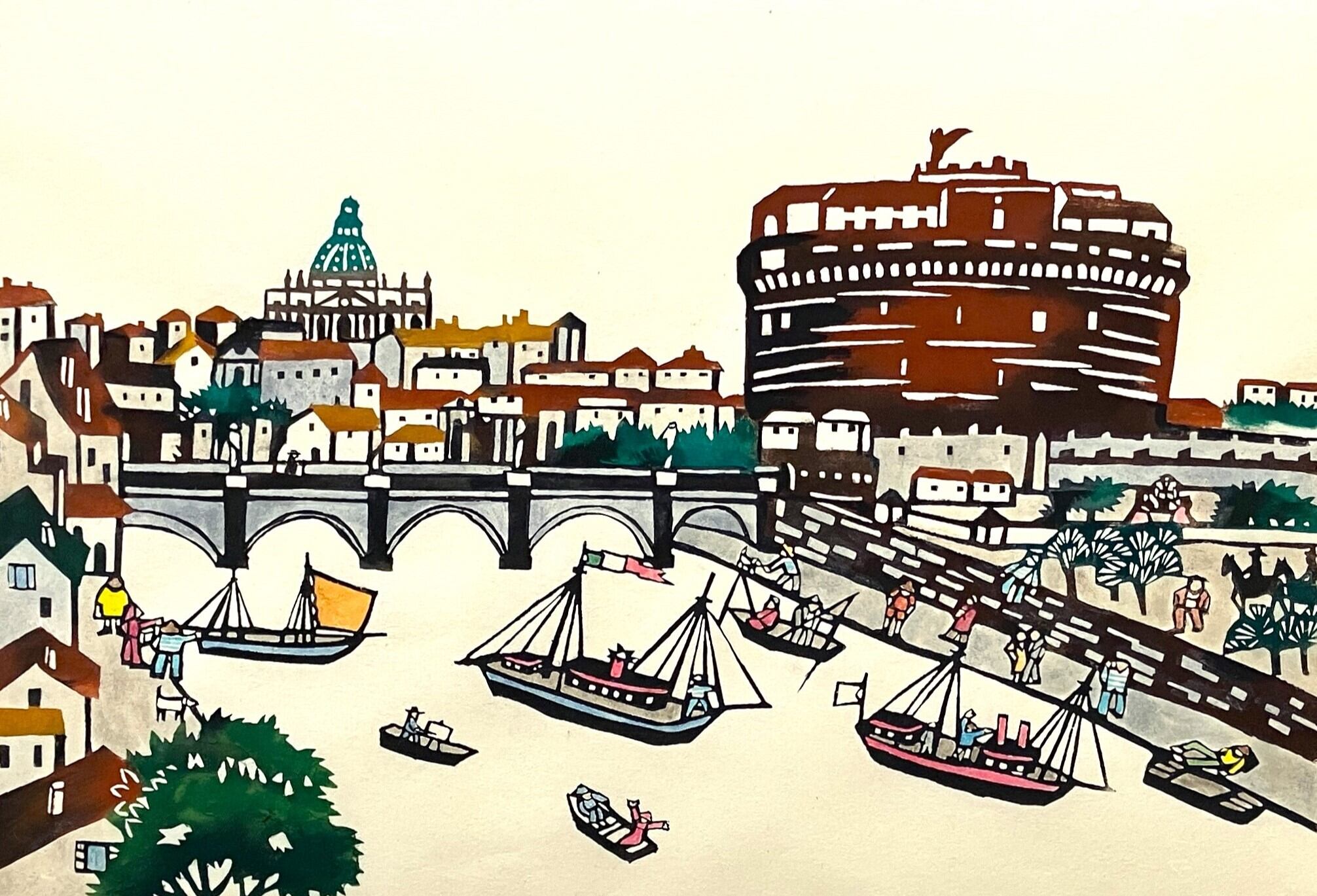 作品タイプ:サンタンジェロ城は、ローマのテヴェレ川右岸にある城塞である。 正面にはサンタンジェロ橋がある。 約700メートル離れたバチカンのサン・ピエトロ大聖堂とは城壁上の通路で繋がっている。
